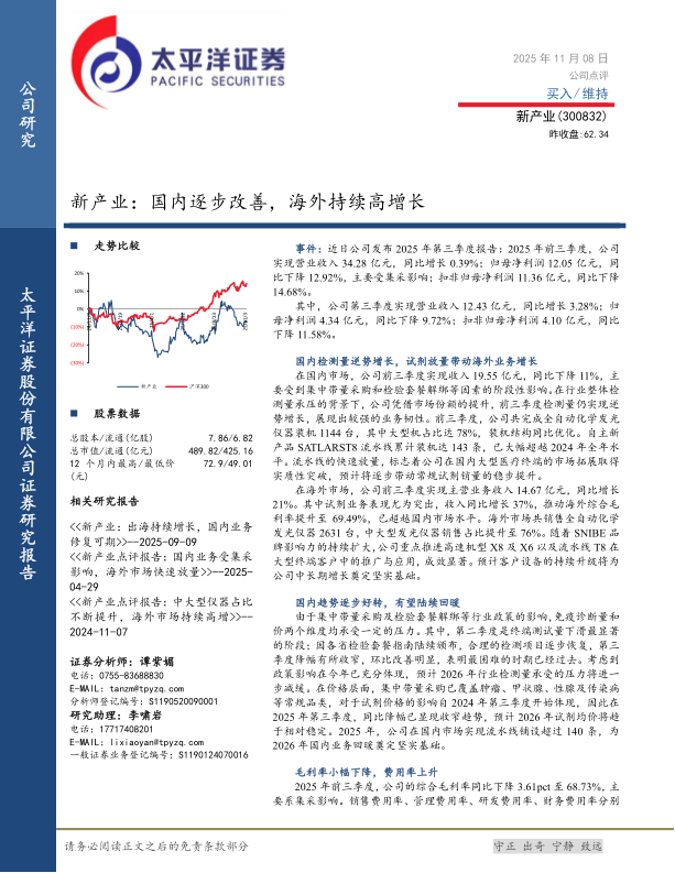 在海外市场,公司前三季度实现主营业务收入14.67亿元,同比增长21%。其中试剂业务表现尤为突出,收入同比增长37%,推动海外综合毛利率提升至69.49%,已超越国内市场水平。海外市场共销售全自动化学发光仪器2631台,中大型发光仪器销售占比提升至76%。随着SNIBE品牌影响力的持续扩大,公司重点推进高速机型X8及X6以及流水线T8在大型终端客户中的推广与应用,成效显著。预计客户设备的持续升级将为公司中长期增长奠定坚实基础。
