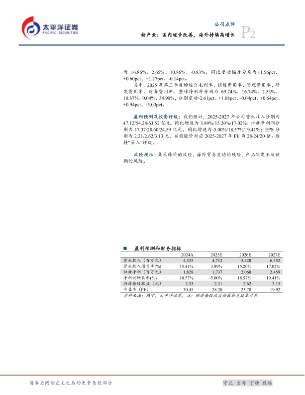 盈利预测及投资评级:我们预计,2025-2027年公司营业收入分别为47.12/54.28/63.52亿元,同比增速为3.89%/15.20%/17.02%;归母净利润分别为17.37/20.60/24.59亿元,同比增速为-5.00%/18.57%/19.41%;EPS分别为2.21/2.62/3.13元,当前股价对应2025-2027年PE为28/24/20倍。维持“买入”评级。