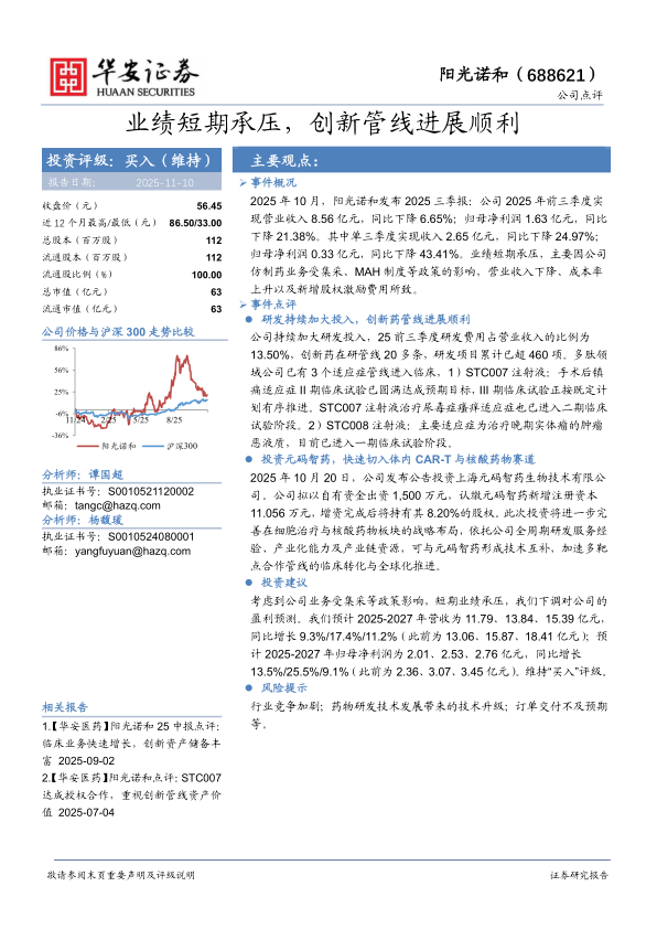 2025年10月,阳光诺和发布2025三季报:公司2025年前三季度实现营业收入8.56亿元,同比下降6.65%;归母净利润1.63亿元,同比下降21.38%。其中单三季度实现收入2.65亿元,同比下降24.97%;归母净利润0.33亿元,同比下降43.41%。业绩短期承压,主要因公司仿制药业务受集采、MAH制度等政策的影响,营业收入下降、成本率上升以及新增股权激励费用所致。