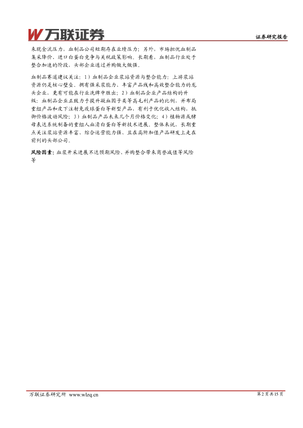 血制品赛道建议关注:1)血制品企业浆站资源与整合能力:上游浆站资源仍是核心壁垒。拥有强采浆能力、丰富产品线和高效整合能力的龙头企业,更有可能在行业洗牌中胜出;2)血制品企业产品结构的升级:血制品企业正致力于提升凝血因子类等高毛利产品的比例,并布局重组产品和皮下注射免疫球蛋白等新型产品,有利于优化收入结构,抵御价格波动风险;3)血制品产品未来几个月价格变化;4)植物源或酵母表达系统制备的重组人血清白蛋白等新技术进展。整体来说,长期重点关注浆站资源丰富、综合运营能力强、且在高附加值产品研发上走在前列的头部公司。