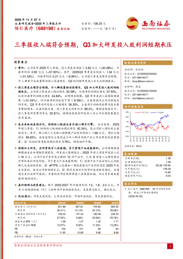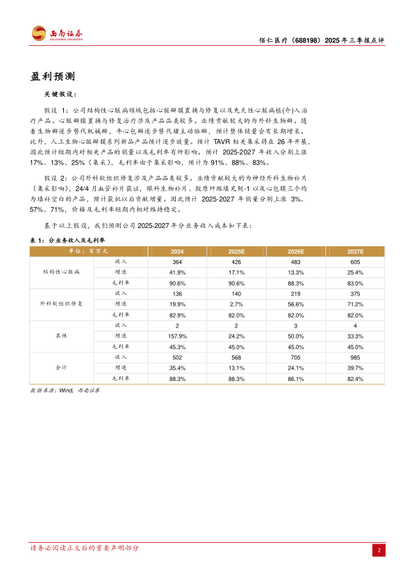 盈利预测与投资建议。 预计 2025-2027 年归母净利润 1.5、 1.8、 2.4 亿元。作为以动物源性植(介)入材料为平台的创新龙头,未来潜力较大, 建议关注。