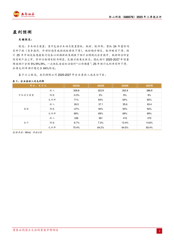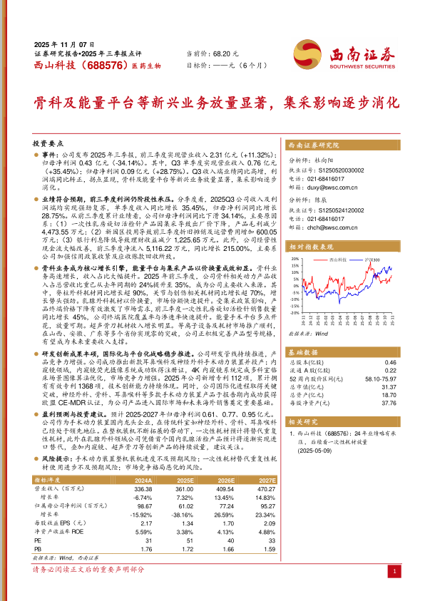 事件:公司发布]2025年三季报,前三季度实现营业收入2.31亿元(+11.32%);归母净利润0.43亿元(-34.14%)。其中,Q3单季度实现营业收入0.76亿元(+35.45%);归母净利润0.09亿元(+28.75%)。Q3收入端业绩同比高增,利润端同比转正,拐点显现,骨科及能量平台等新兴业务放量显著,集采影响逐步消化。