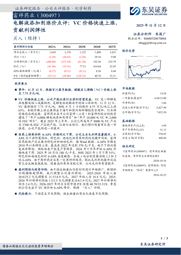 VC价格快速上涨,公司产能位居行业前列有望受益。VC是一种锂电池电解液核心成膜助剂,是锂电池电解液中的核心添加剂。11月12日,VC最新报价7.75万元/吨,相较9月1日的报价4.75万元/吨已上涨63%。本轮价格上涨主要得益于海外和国内西部储能需求增加,行业供需格局出现反转。富祥药业在子公司富祥(山东)和富祥科技分别投资建设了“年产6,000t锂电池添加剂项目”和“年产10,000吨VC和2,000吨FEC项目”。截至2025年上半年,公司已形成年产8000吨VC产品及3700吨FEC产品的产能,位居行业前列。我们预计随着项目进一步推进,公司产能将进一步提升。
