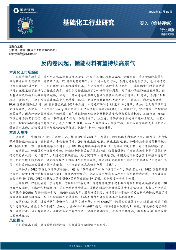 本周市场有所震荡,其中申万化工指数上涨2.61%,跑赢沪深300指数3.69%。标的方面,受益于储能高景气,本周锂电材料表现强势,行情从六氟、VC演绎到其它环节。行业边际变化方面,本周反内卷变化多多,包括网传光伏行业收储计划“黄了”、己内酰胺以及有机硅反内卷,光伏作为反内卷的重点行业之一,其边际变化时刻牵动着市场;在这里谈下基础化工行业反内卷,我们认为行业经历了3-4年的下行周期,到了这个阶段即使没有政策,行业基本面边际向上的概率越来越高,方向上,可以考虑适当布局基本面估值双底部的子行业。AI行业,本周行业分歧进一步拉大,一边是行业基建端高景气度持续,比如:黄仁勋亲赴台积电“要产能”,再比如:内存需求火爆,DRAM价格预期再度上调,AI巨头甚至疯抢2027年产能;一边是市场对于AI泡沫担忧持续,比如:巴克莱下调甲骨文债务评级,再比如:“大空头”Burry指出科技巨头“低估折旧导致利润虚高”。储能行业,宁德时代、阿特斯双双签大单,国内外储能需求迎来共振时刻,我们建议持续关注储能材料供需变化带来的投资机会。石油行业,OPEC下调全球石油需求预估,Q3由“供不应求”转为“供过于求”,往后看,石油价格承压的概率进一步增大。机器人行业,特斯拉拟扩建得州超级工厂,年产1000万台Optimus人形机器人。投资方面,我们认为需要把更多研究重心放在需求上面,建议关注需求增速较快的子行业,包括AI材料、储能材料。