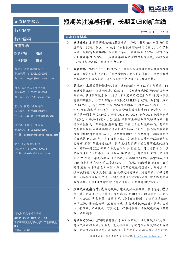 周观点:本周医药行情走势较强,我们推测主要有以下几点原因:1)流感疫情正处于快速爬坡期,南北方ILI(流感样病例)均超过往年同期水平,根据国家流感中心11月13日发布的《2025年第45周中国流感监测周报》,南方省份哨点医院报告的ILI%为5.5%,高于前一周水平(4.6%),高于2022年和2024年同期水平(3.2%和3.5%),低于2023年同期水平(5.7%);北方省份哨点医院报告的ILI%为6.1%,高于前一周水平(5.1%),高于2022年,2023年和2024年同期水平(2.0%,4.9%和3.6%)。2)2025年国家医保谈判结果即将公布,根据国家医保局,今年医保谈判有120家内外资企业现场参与,其中参与基本医保药品目录谈判竞价的目录外药品127个,参与商保创新药目录价格协商的药品24个,谈判结果预计12月初公布,新版药品医保目录将于2026年1月1日起实施。3)近期百济神州和诺诚健华先后发布2025年三季度业绩,再次见证创新药重磅品种商业化的爆发力:百济神州2025年第三季度总收入14亿美元,同比增长41%,其中百悦泽®(泽布替尼)全球收入10亿美元,同比增长51%;诺诚健华2025年前三季度总收入11.2亿元,同比增长59.8%;其中核心产品BTK抑制剂奥布替尼前三季度收入10.1亿元,同比增长45.8%,公司预计2025全年实现盈亏平衡(提前两年实现盈利目标)。展望后市,短期我们建议关注流感行情,重点布局流感疫苗、流感用药、呼吸道检测、用药终端等细分方向;长期我们建议回归创新主线,重点布局高端医疗器械、CXO及生命科学上游产业链、创新药等细分方向。