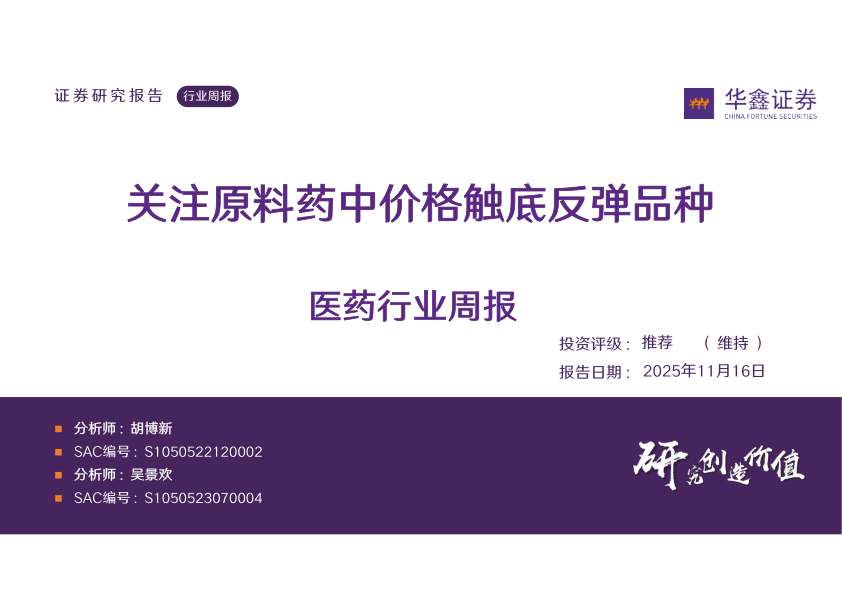 1)关注原料药周期触底反转的品种,关注【富祥药业】、【司太立】,合成生物学赋能,关注【奥翔药业】。