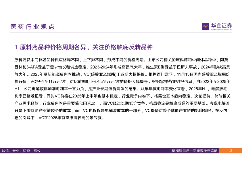 原料药及中间体各品种供应格局不同,上下游不同,形成不同的价格周期。上市公司相关的原料药和中间体品种中,阿莫西林和6-APA受益于需求增长和供应稳定,2023-2024年形成高景气大年,维生素E则受益于巴斯夫事故,2024年形成高景气大年。2025年受新能源反内卷推动,VC(碳酸亚乙烯酯)于近期大幅提价。根据百川盈孚,11月13日国内碳酸亚乙烯酯价格行情,VC报价至11万元/吨,对比前期8月份不足5万元/吨的价格大幅提升。根据富祥药业财报信息,自2022年至2025年H1,公司电解液添加剂毛利率一直为负,是产业长期低价竞争的结果。从半年度毛利率变化来看,2025年H1,电解液毛利率已接近扭亏,同时VC价格在2025年上半年也基本稳定,行业竞争内卷下,格局也基本趋向稳定。次轮提价,储能相关产业需求释放,行业反内卷是重要催化因素之一,而VC经过长期低价竞争,格局稳定是触底反弹的重要基础。考虑电解液只是下游储能产业链较少的成本,而且VC也仅仅是电解液成本的一部分,VC提价对整个储能产业链的影响有限。在反内卷的引导下,VC在2026年有望维持较高的景气度。