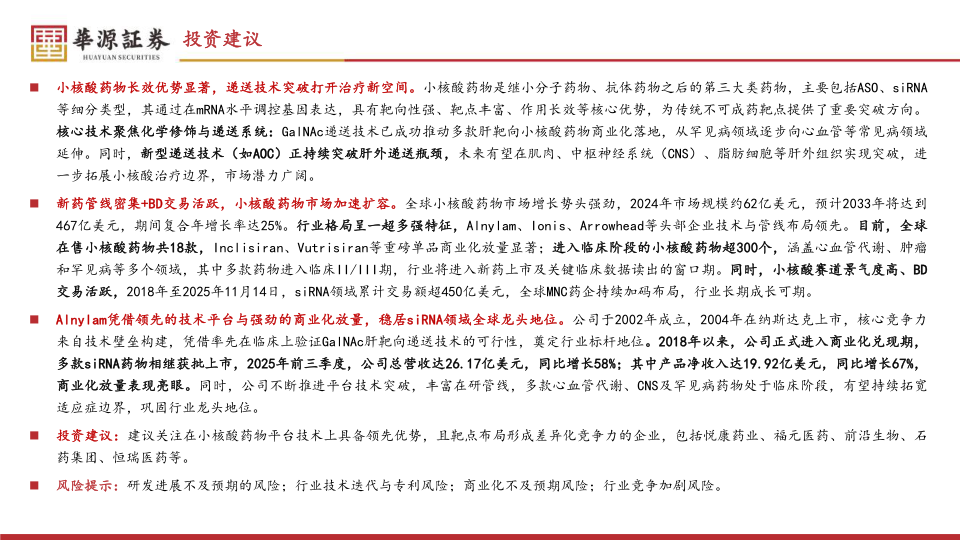 新药管线密集+BD交易活跃, 小核酸药物市场加速扩容。 全球小核酸药物市场增长势头强劲, 2024年市场规模约62亿美元, 预计2033年将达到467亿美元, 期间复合年增长率达25%。 行业格局呈一超多强特征, Alnylam、 Ionis、 Arrowhead等头部企业技术与管线布局领先。 目前, 全球在售小核酸药物共18款, Inclisiran、 Vutrisiran等重磅单品商业化放量显著; 进入临床阶段的小核酸药物超300个, 涵盖心血管代谢、 肿瘤和罕见病等多个领域, 其中多款药物进入临床II/III期, 行业将进入新药上市及关键临床数据读出的窗口期。 同时, 小核酸赛道景气度高、 BD交易活跃, 2018年至2025年11月14日, siRNA领域累计交易额超450亿美元, 全球MNC药企持续加码布局, 行业长期成长可期。