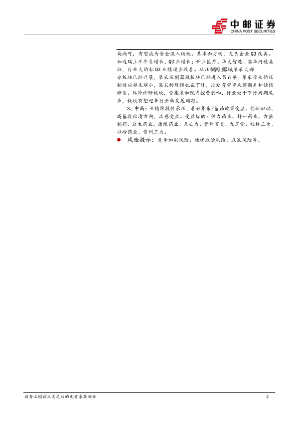 2、医疗器械:从整体生物医药板块中看,创新药资金拥挤度相比Q2略有下降,部分资金从创新药暂时撤退,医疗器械整体行业格局尚可,有望成为资金流入板块。基本面方面,龙头企业Q3改善。如迈瑞上半年负增长,Q3正增长;开立医疗、华大智造、澳华内镜类似,行业大的标Q3业绩逐步改善。从压制因素上看,器械集采大部