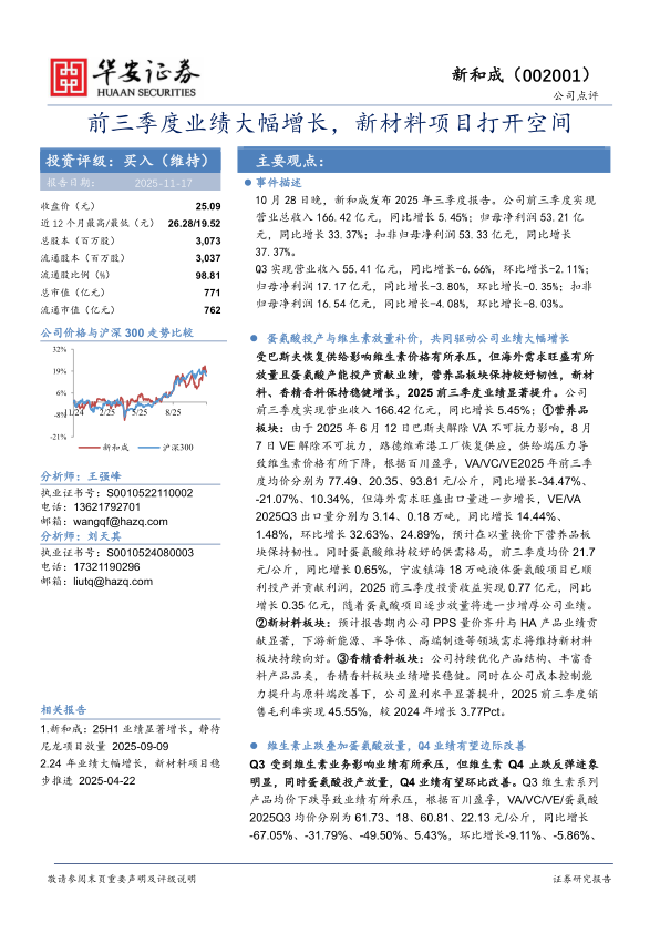 蛋氨酸投产与维生素放量补价,共同驱动公司业绩大幅增长受巴斯夫恢复供给影响维生素价格有所承压,但海外需求旺盛有所放量且蛋氨酸产能投产贡献业绩,营养品板块保持较好韧性,新材料、香精香料保持稳健增长,2025前三季度业绩显著提升。公司前三季度实现营业收入166.42亿元,同比增长5.45%;①营养品板块:由于2025年6月12日巴斯夫解除VA不可抗力影响,8月7日VE解除不可抗力,路德维希港工厂恢复供应,供给端压力导致维生素价格有所下降,根据百川盈孚,VA/VC/VE2025年前三季度均价分别为77.49、20.35、93.81元/公斤,同比增长-34.47%、-21.07%、10.34%,但海外需求旺盛出口量进一步增长,VE/VA2025Q3出口量分别为3.14、0.18万吨,同比增长14.44%、1.48%,环比增长32.63%、24.89%,预计在以量换价下营养品板块保持韧性。同时蛋氨酸维持较好的供需格局,前三季度均价21.7元/公斤,同比增长0.65%,宁波镇海18万吨液体蛋氨酸项目已顺利投产并贡献利润,2025前三季度投资收益实现0.77亿元,同比增长0.35亿元,随着蛋氨酸项目逐步放量将进一步增厚公司业绩。②新材料板块:预计报告期内公司PPS量价齐升与HA产品业绩贡献显著,下游新能源、半导体、高端制造等领域需求将维持新材料板块持续向好。③香精香料板块:公司持续优化产品结构、丰富香料产品品类,香精香料板块业绩增长稳健。同时在公司成本控制能力提升与原料端改善下,公司盈利水平显著提升,2025前三季度销售毛利率实现45.55%,较2024年增长3.77Pct。