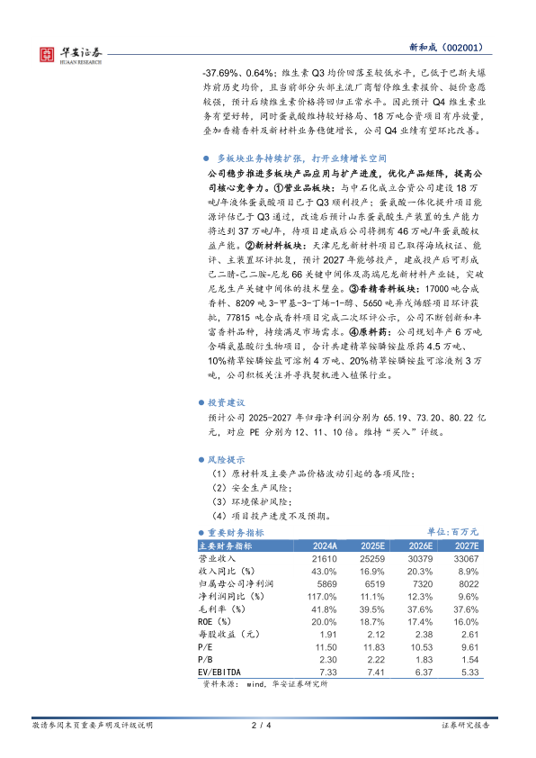 Q3受到维生素业务影响业绩有所承压,但维生素Q4止跌反弹迹象明显,同时蛋氨酸投产放量,Q4业绩有望环比改善。Q3维生素系列产品均价下跌导致业绩有所承压,根据百川盈孚,VA/VC/VE/蛋氨酸2025Q3均价分别为61.73、18、60.81、22.13元/公斤,同比增长-67.05%、-31.79%、-49.50%、5.43%,环比增长-9.11%、-5.86%、-37.69%、0.64%;维生素Q3均价回落至较低水平,已低于巴斯夫爆炸前历史均价,且当前部分头部主流厂商暂停维生素报价、挺价意愿较强,预计后续维生素价格将回归正常水平。因此预计Q4维生素业务有望好转,同时蛋氨酸维持较好格局、18万吨合资项目有序放量,叠加香精香料及新材料业务稳健增长,公司Q4业绩有望环比改善。