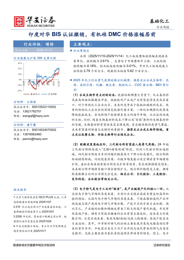 基础化工行业周报:印度对华BIS认证撤销,有机硅DMC价格涨幅居前