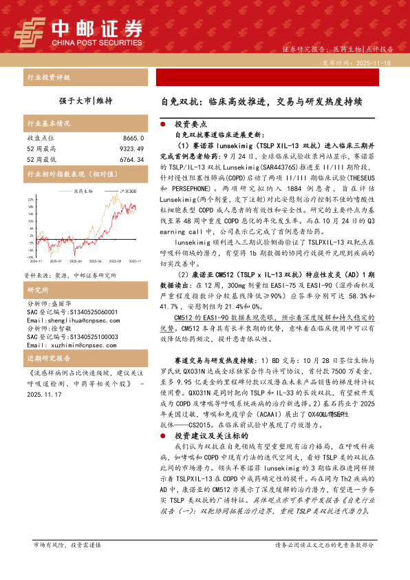我们认为双抗在自免领域有望重塑现有治疗格局,在呼吸科疾病,如哮喘和COPD中现有疗法的迭代空间大,看好TSLP类的双抗在此间的市场潜力。领头羊赛诺菲lunsekimig的3期临床推进同样预示着TSLPXIL-13在COPD中成药确定性的提升。而在同为Th2疾病的AD中,康诺亚的CM512亦展示了深度缓解的治疗潜力,有望进一步夯TSLP类双抗的广谱特征。具体观点亦可参考外发报告《自免行业报告(一):双靶协同拓展治疗边界,重视TSLP类双抗迭代潜力》。