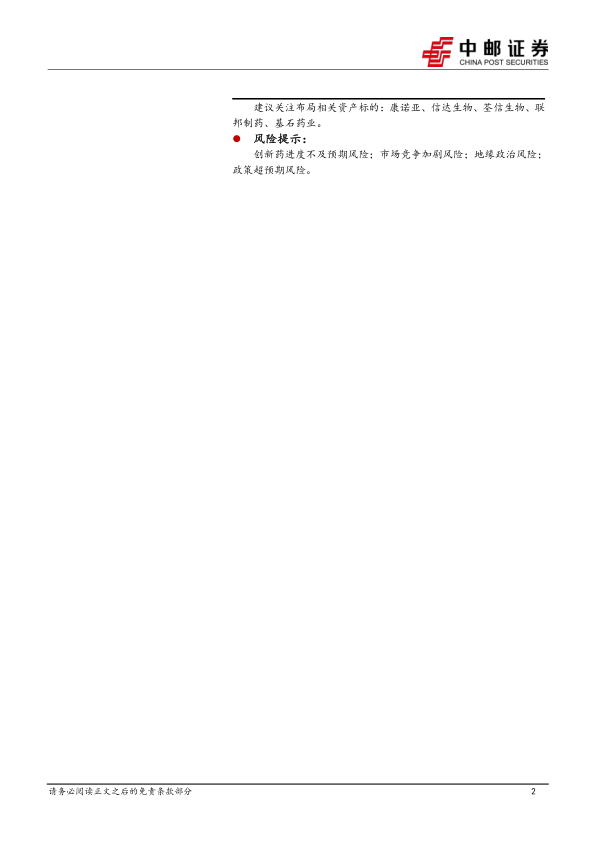创新药进度不及预期风险;市场竞争加剧风险;地缘政治风险;政策超预期风险。
