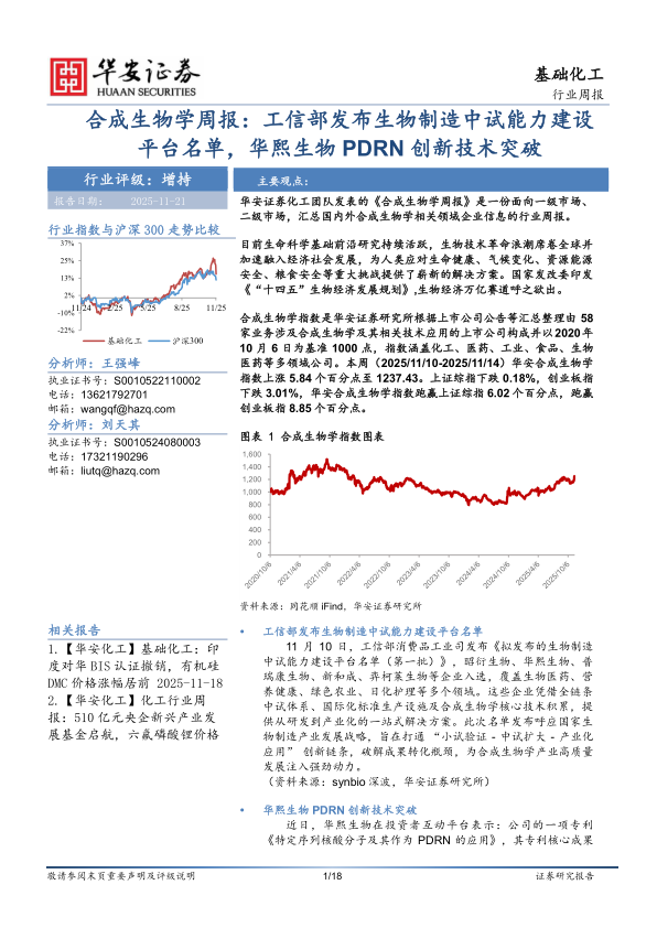 合成生物学指数是华安证券研究所根据上市公司公告等汇总整理由58家业务涉及合成生物学及其相关技术应用的上市公司构成并以2020年10月6日为基准1000点,指数涵盖化工、医药、工业、食品、生物医药等多领域公司。本周(2025/11/10-2025/11/14)华安合成生物学指数上涨5.84个百分点至1237.43。上证综指下跌0.18%,创业板指下跌3.01%,华安合成生物学指数跑赢上证综指6.02个百分点,跑赢创业板指8.85个百分点。