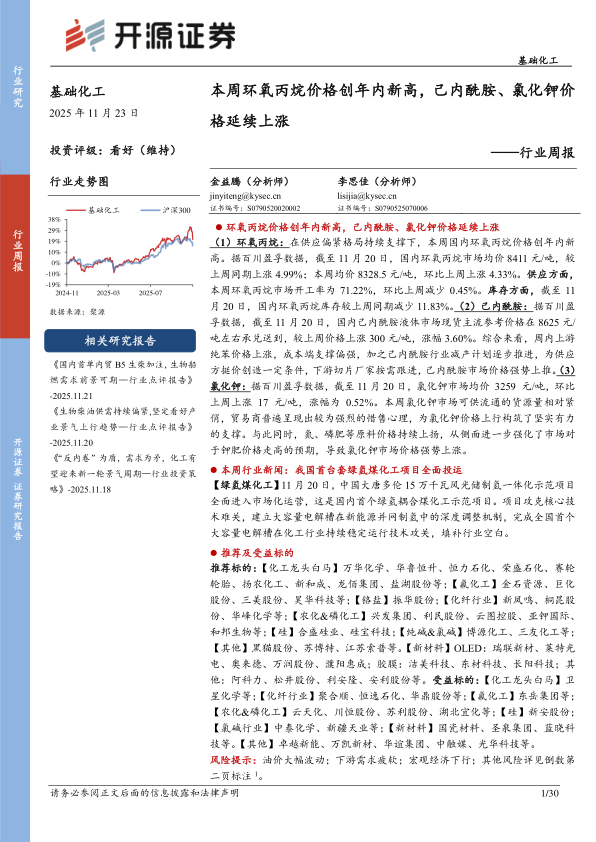 基础化工行业周报:本周环氧丙烷价格创年内新高,己内酰胺、氯化钾价格延续上涨