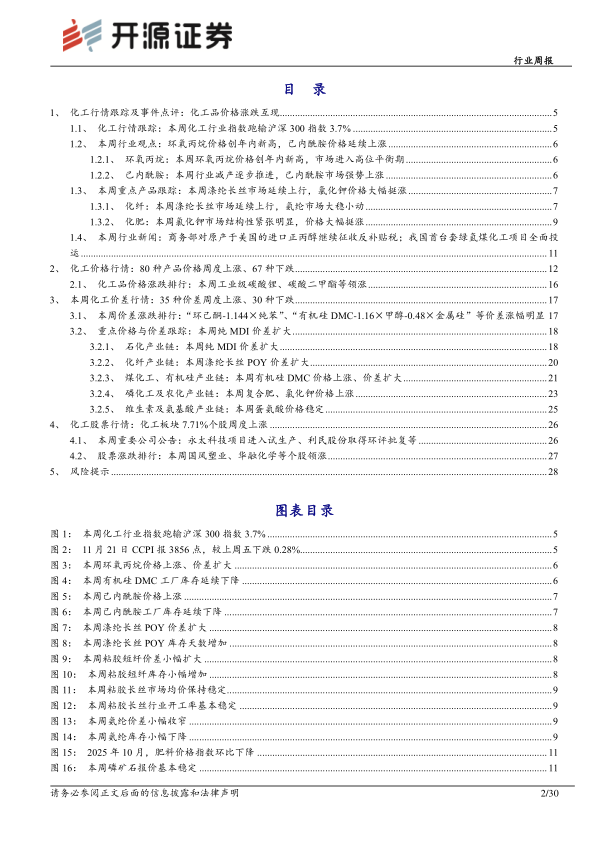 (1)环氧丙烷:在供应偏紧格局持续支撑下,本周国内环氧丙烷价格创年内新高。据百川盈孚数据,截至11月20日,国内环氧丙烷市场均价8411元/吨,较上周同期上涨4.99%;本周均价8328.5元/吨,环比上周上涨4.33%。供应方面,本周环氧丙烷市场开工率为71.22%,环比上周减少0.45%。库存方面,截至11月20日,国内环氧丙烷库存较上周同期减少11.83%。(2)己内酰胺:据百川盈孚数据,截至11月20日,国内己内酰胺液体市场现货主流参考价格在8625元/吨左右承兑送到,较上周价格上涨300元/吨,涨幅3.60%。综合来看,周内上游纯苯价格上涨,成本端支撑偏强,加之己内酰胺行业减产计划逐步推进,为供应方挺价创造一定条件,下游切片厂家按需跟进,己内酰胺市场价格强势上推。(3)氯化钾:据百川盈孚数据,截至11月20日,氯化钾市场均价3259元/吨,环比上周上涨17元/吨,涨幅为0.52%。本周氯化钾市场可供流通的货源量相对紧俏,贸易商普遍呈现出较为强烈的惜售心理,为氯化钾价格上行构筑了坚实有力的支撑。与此同时,氮、磷肥等原料价格持续上扬,从侧面进一步强化了市场对于钾肥价格走高的预期,导致氯化钾市场价格强势上涨。