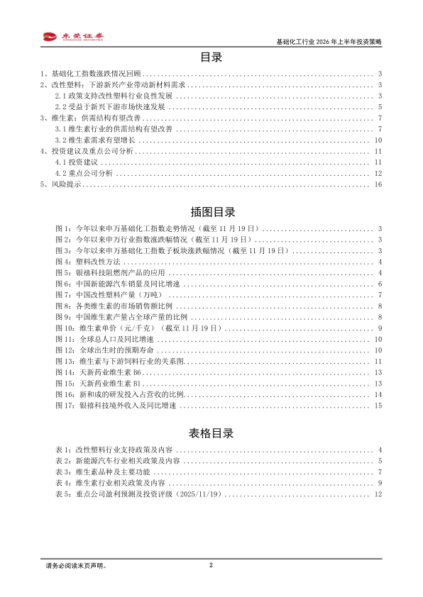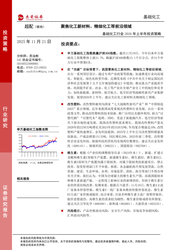 在“双碳”目标背景下,我国聚焦化工新材料、精细化工等前沿领域,出台一系列顶层设计,通过专项产业政策等措施,加速推进行业向高端化、智能化、绿色化转型升级。近期发布的《中共中央关于制定国民经济和社会发展第十五个五年规划的建议》中提到,推动重点产业提质升级,巩固提升矿业、冶金、化工等产业在全球产业分工中的地位和竞争力;加快新能源、新材料、航空航天、低空经济等战略性新兴产业集群发展。展望2026年上半年,建议关注化工新材料及精细化工领域。