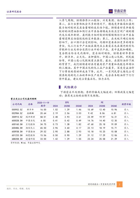 下游需求不及预期;原料价格或大幅波动;环保政策大幅变动;推荐关注标的业绩不及预期。