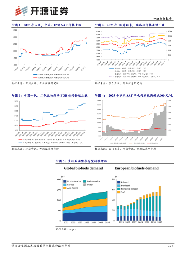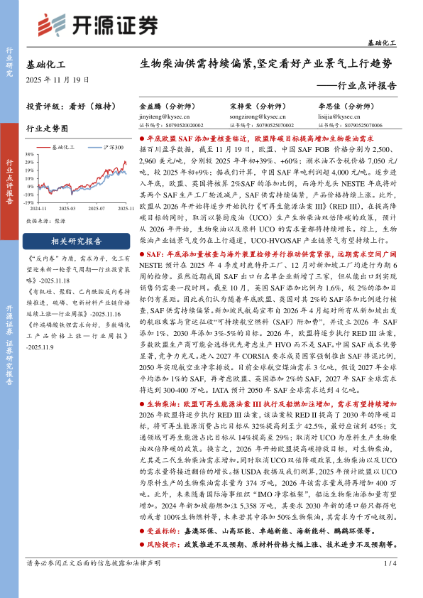 据百川盈孚数据,截至11月19日,欧盟、中国SAF FOB价格分别为2,500、2,960美元/吨,分别较2025年年初+39%、+60%;潲水油不含税价格7,050元/吨,较2025年初+9%;据我们计算,中国SAF单吨利润超4,000元/吨。逐步进入年底,欧盟、英国将核算2%SAF的添加比例,而海外龙头NESTE年底将对其两个SAF生产工厂轮流减产,SAF供需持续偏紧,产品价格持续上涨。此外,欧盟从2026年开始将逐步开始执行《可再生能源法案III》(RED III),在提高降碳目标的同时,取消以餐厨废油(UCO)生产生物柴油双倍降碳的政策,预计从2026年开始,生物柴油以及原料UCO的需求量都将持续增长。综上,生物柴油产业链景气度仍在上行通道,UCO-HVO/SAF产业链景气有望持续上行。