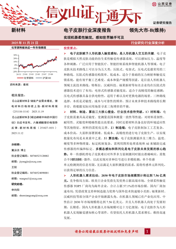 人形机器人需求拉动, 2030 年电子皮肤市场规模预计将达到 7.56 亿美元。 竞争格局方面, 欧美日企业凭借先发优势占据高端市场, 全球柔性触觉传感器 TOP5 厂商均为海外企业, 合计占据 57.1%的市场份额。 国内厂商加速布局, 凭借政策支持和制造能力优势与国外技术快速缩小差距, 福莱新材、汉威科技等部分国产企业开始渐露头角, 在机器人领域已有产业化应用。 中性估计 2030 年市场规模将达到 7.56 亿美元。 并且人形机器人尚处于发展初期, 长期看, 国内人形机器人市场规模可达十万亿级别, 电子皮肤作为人形机器人实现触觉感知核心零部件, 有望依托人形机器人需求增长, 维持高速发展