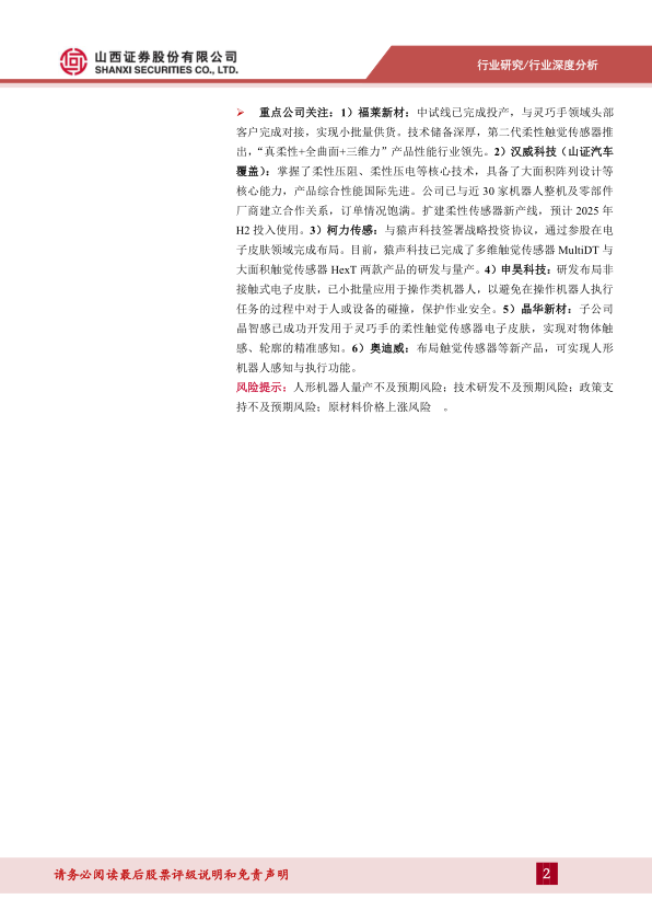 重点公司关注: 1) 福莱新材: 中试线已完成投产, 与灵巧手领域头部客户完成对接, 实现小批量供货。 技术储备深厚, 第二代柔性触觉传感器推出, “真柔性+全曲面+三维力” 产品性能行业领先。 2) 汉威科技(山证汽车覆盖): 掌握了柔性压阻、 柔性压电等核心技术, 具备了大面积阵列设计等核心能力, 产品综合性能国际先进。 公司已与近 30 家机器人整机及零部件厂商建立合作关系, 订单情况饱满。 扩建柔性传感器新产线, 预计 2025 年H2 投入使用。 3) 柯力传感: 与猿声科技签署战略投资协议, 通过参股在电子皮肤领域完成布局。 目前, 猿声科技已完成了多维触觉传感器 MultiDT 与大面积触觉传感器 HexT 两款产品的研发与量产。 4) 申昊科技: 研发布局非接触式电子皮肤, 已小批量应用于操作类机器人, 以避免在操作机器人执行任务的过程中对于人或设备的碰撞, 保护作业安全。 5) 晶华新材: 子公司晶智感已成功开发用于灵巧手的柔性触觉传感器电子皮肤, 实现对物体触感、 轮廓的精准感知。 6) 奥迪威: 布局触觉传感器等新产品, 可实现人形机器人感知与执行功能。