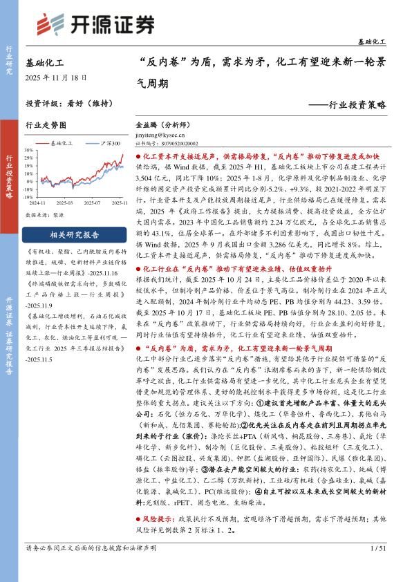 供给端,据Wind数据,截至2025年H1,基础化工板块上市公司在建工程共计3,504亿元,同比下降10%;2025年1-8月,化学原料及化学制品制造业、化学纤维的固定资产投资完成额累计同比分别-5.2%、+9.3%,较2021-2022年明显下行。行业资本开支及产能投放周期接近尾声,行业供给格局已在缓慢修复。需求端,2025年《政府工作报告》提出,大力提振消费、提高投资效益,全方位扩大国内需求。2023年中国化工品销售额约2.24万亿欧元,占全球化工品销售总额的43.1%,位居全球第一。在外部诸多不利因素影响下,我国出口韧性十足。据Wind数据,2025年9月我国出口金额3,286亿美元,同比增长8%。综上,化工资本开支接近尾声,供需格局修复,“反内卷”推动下修复进度或加快。