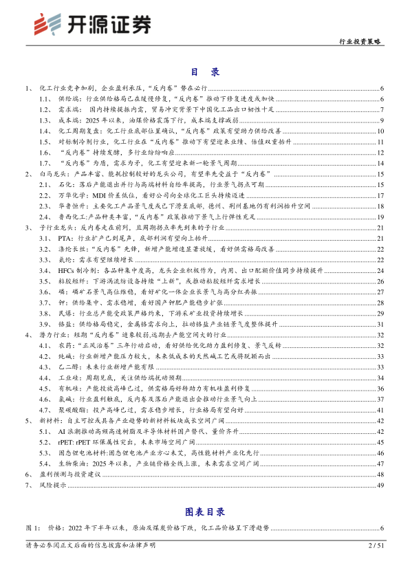 化工中部分行业已逐步落实“反内卷”措施,有望给其他子行业提供可借鉴的“反内卷”发展思路。我们认为在“反内卷”浪潮席卷而来的当下,新一轮供给侧改革呼之欲出,化工行业供需格局有望进一步优化,其中化工行业龙头企业有望凭借更加规范的管理体系、更好的能耗控制水平获得更多市场份额,这是化工行业整体的重大拐点。建议关注以下方向:①建议首先增配产品丰富、体量大的龙头公司:石化(恒力石化、万华化学)、煤化工(华鲁恒升、鲁西化工)、其他白马(新和成、龙佰集团、赛轮轮胎);②优先关注在反内卷走在前列且周期拐点率先到来的子行业(涨价):涤纶长丝+PTA(新凤鸣、桐昆股份、三房巷)、氨纶(华峰化学、新乡化纤)、制冷剂(巨化股份、三美股份)、粘胶短纤(三友化工)、磷化工(云图控股、兴发集团)、钾肥(盐湖股份、亚钾国际)、民爆(雅化集团)、铬盐(振华股份)等;③潜在去产能空间较大的行业:农药(扬农化工)、纯碱(博源化工、中盐化工)、乙二醇(万凯新材)、工业硅/有机硅(合盛硅业)、氯碱(嘉化能源、氯碱化工)、PC(维远股份);④自主可控以及未来成长空间较大的新材料:光刻胶、rPET、固态电池、生物柴油。