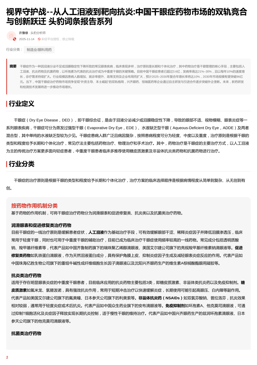 视界守护战--从人工泪液到靶向抗炎:中国干眼症药物市场的双轨竞合与创新跃迁 头豹词条报告系列