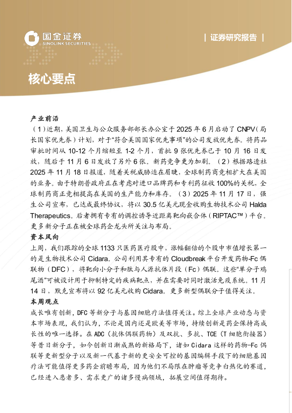 成长唯有创新,DFC等新分子与基因细胞疗法值得关注。综上全球产业动态与资本市场表现,我们认为,不论是国内还是欧美等市场,持续创新是药企保持高成长性的唯一选择。在ADC(抗体偶联药物)及双抗、多抗、TCE(T细胞衔接器)等昔日新分子,如今创新日渐成熟的新格局下,诸如Cidara这样的药物-Fc偶联等更新型分子以及新一代基于新的更安全可控的基因编辑手段下的细胞基因疗法可能值得更多药企前瞻布局,因为他们不局限在肿瘤等竞争白热化的赛道,已经进入患者多、需求更广的诸多慢病领域,拓展空间值得期待。