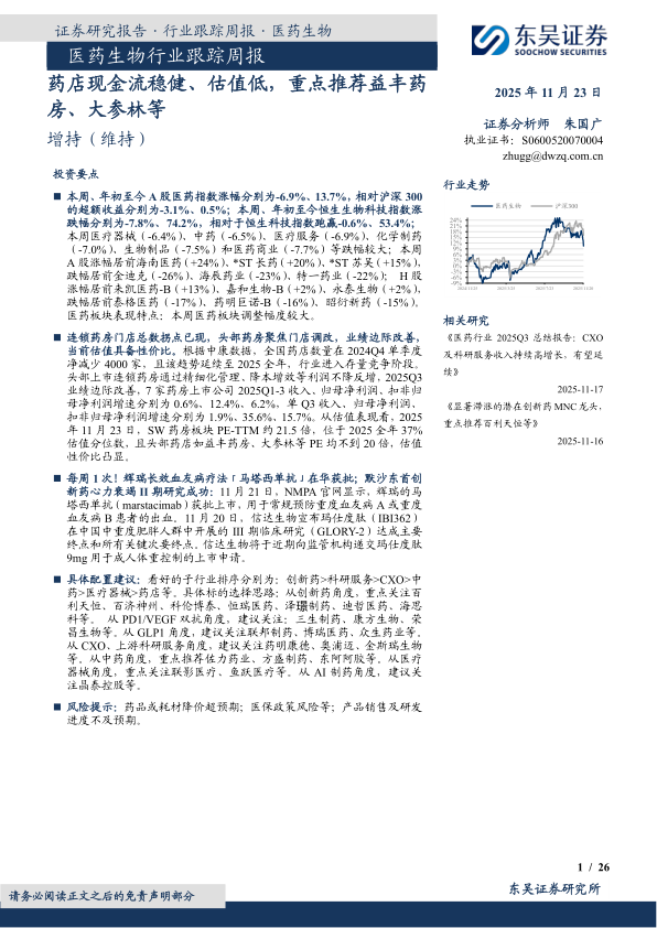连锁药房门店总数拐点已现,头部药房聚焦门店调改,业绩边际改善,当前估值具备性价比。根据中康数据,全国药店数量在2024Q4单季度净减少4000家,且该趋势延续至2025全年,行业进入存量竞争阶段。头部上市连锁药房通过精细化管理、降本增效等利润不降反增,2025Q3业绩边际改善,7家药房上市公司2025Q1-3收入、归母净利润、扣非归母净利润增速分别为0.6%、12.4%、6.2%,单Q3收入、归母净利润、扣非归母净利润增速分别为1.9%、35.6%、15.7%。从估值表现看,2025年11月23日,SW药房板块PE-TTM约21.5倍,位于2025全年37%估值分位数,且头部药店如益丰药房、大参林等PE均不到20倍,估值性价比凸显。