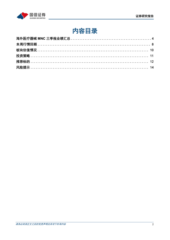 美股医疗器械MNC陆续披露2025Q3业绩,不同赛道表现分化明显。根据25Q3医疗器械MNC的整体业绩表现来看,耗材类产品的增长快于设备类及IVD类产品,尤其是心脏电生理、结构性心脏病等赛道维持较高的收入增长速度,器械MNC的竞争焦点已经逐步从存量的传统产品市场转向创新大单品的商业化推进上。医疗器械MNC认为中国市场短期内依然存在价格、政策及整体经济环境上的限制,但部分公司认为已经出现边际改善的迹象,并且坚定看好中国医疗器械市场长期的增长潜力。
