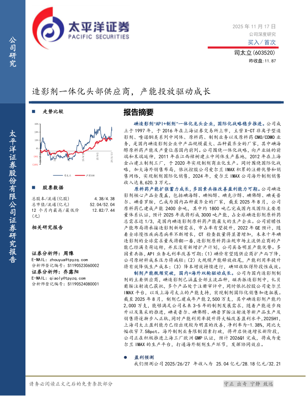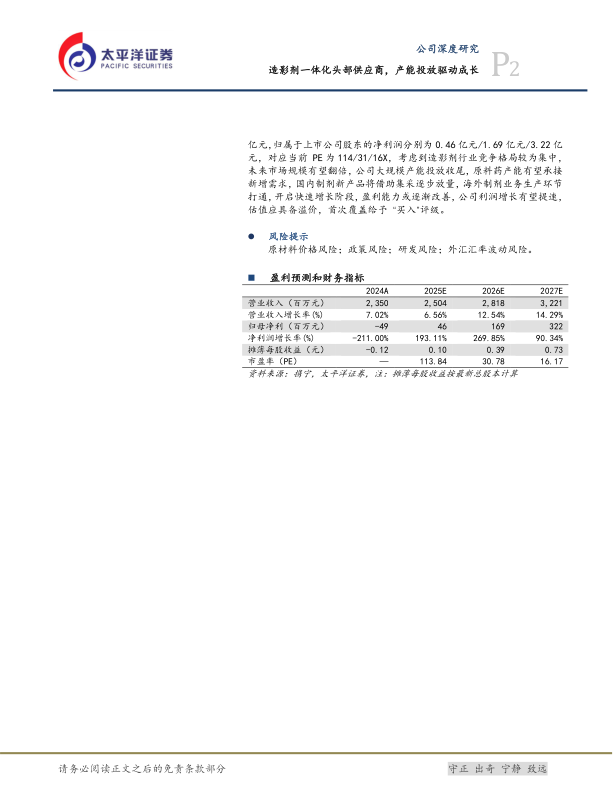 我们预测公司2025/26/27年收入为25.04亿元/28.18亿元/32.21亿元,归属于上市公司股东的净利润分别为0.46亿元/1.69亿元/3.22亿元,对应当前PE为114/31/16X,考虑到造影剂行业竞争格局较为集中,未来市场规模有望翻倍,公司大规模产能投放收尾,原料药产能有望承接新增需求,国内制剂新产品将借助集采逐步放量,海外制剂业务生产环节打通,开启快速增长阶段,盈利能力或逐渐改善,公司利润增长有望提速,估值应具备溢价,首次覆盖给予“买入”评级。