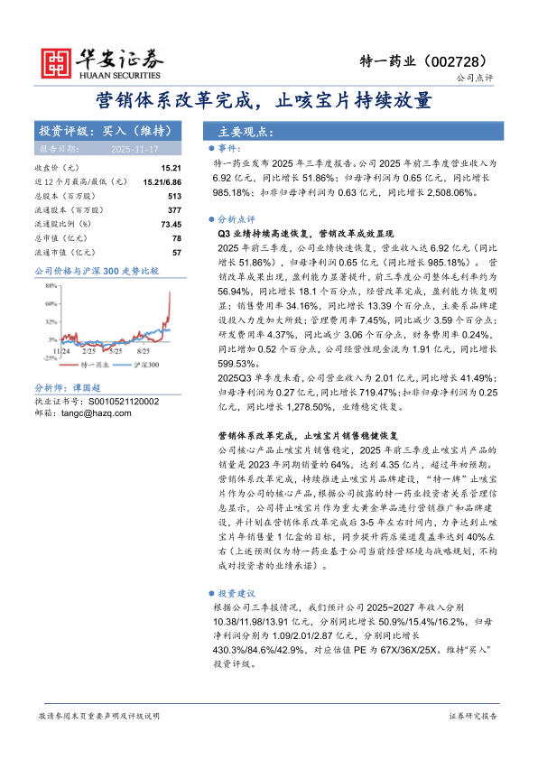 公司核心产品止咳宝片销售稳定,2025年前三季度止咳宝片产品的销量是2023年同期销量的64%,达到4.35亿片,超过年初预期。营销体系改革完成,持续推进止咳宝片品牌建设,“特一牌”止咳宝片作为公司的核心产品,根据公司披露的特一药业投资者关系管理信息显示,公司将止咳宝片作为重大黄金单品进行营销推广和品牌建设,并计划在营销体系改革完成后3-5年左右时间内,力争达到止咳宝片年销售量1亿盒的目标,同步提升药店渠道覆盖率达到40%左右(上述预测仅为特一药业基于公司当前经营环境与战略规划,不构成对投资者的业绩承诺)。