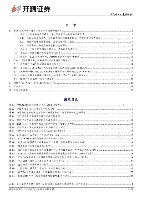 公司主要从事兽药原料药、医药原料药及中间体的研发、生产和销售,是行业内磺胺类原料药及中间体产业链最长、品种最全、最具竞争力的企业之一。公司于2016年被评为国家高新技术企业并延续至今。公司2025年前三季度营收与归母净利润双增,实现营业收入1.64亿元,同比增长40.89%;归属于上市公司股东的净利润达4905万元,同比增长47.16%。募投项目将继续发挥产业链深度与由此积攒的毛利率优势,同时进一步向医药原料药领域拓展。我们预计公司2025-2027年的归母净利润分别为0.66/0.76/0.87亿元,对应EPS分别为0.66/0.76/0.87元/股,对应PE为27.9/24.3/21.2X,首次覆盖,给予“增持”评级。