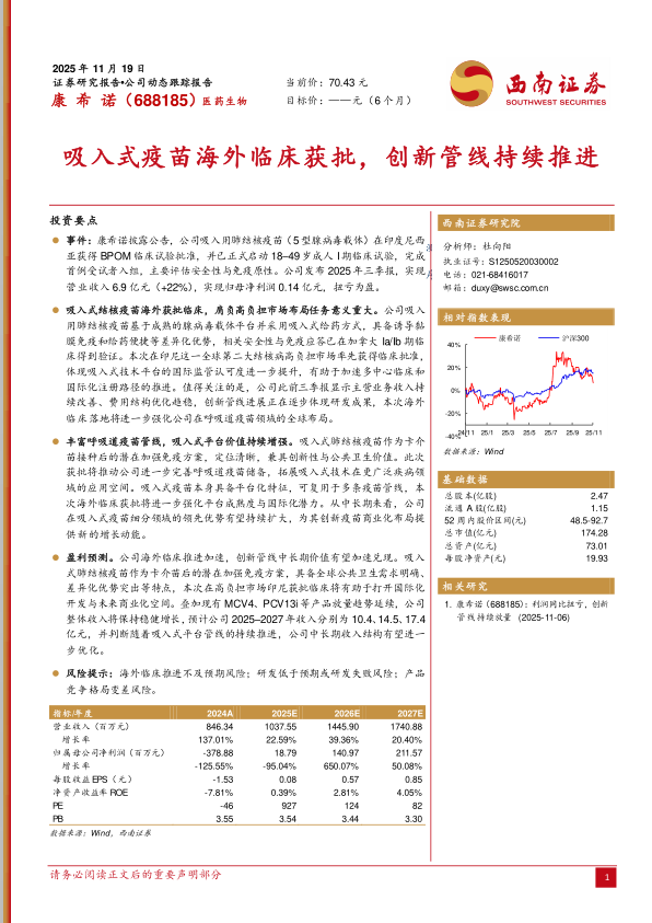 盈利预测。公司海外临床推进加速,创新管线中长期价值有望加速兑现。吸入式肺结核疫苗作为卡介苗后的潜在加强免疫方案,具备全球公共卫生需求明确、差异化优势突出等特点,本次在高负担市场印尼获批临床将有助于打开国际化开发与未来商业化空间。叠加现有MCV4、PCV13i等产品放量趋势延续,公司整体收入将保持稳健增长,预计公司2025–2027年收入分别为10.4、14.5、17.4亿元,并判断随着吸入式平台管线的持续推进,公司中长期收入结构有望进一步优化。