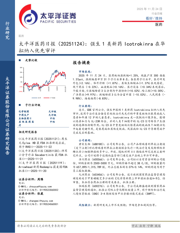 医药日报:强生1类新药Icotrokinra在华拟纳入优先审评