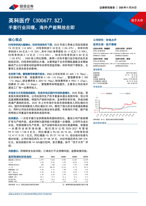 投资建议:一次性手套行业供需格局有望持续优化,叠加公司产能规模扩张与产线升级,成本控制与盈利能力有望进一步增强。公司作为龙头企业,凭借规模化生产优势、全产业链布局及全球化渠道网络,有望进一步提升全球市场份额。我们预计公司2025-2027年营收99.9/120.1/138.8亿元,同比增速4.9%/20.2%/15.6%,归母净利润12.4/17.0/20.1亿元,同比增速-15.3%/37.1%/18.1%。综合绝对估值与相对估值,公司价格区间为44.07-48.59元,对应市值区间为289-318亿元,较当前股价有14-26%溢价空间,首次覆盖,给予“优于大市”评级。