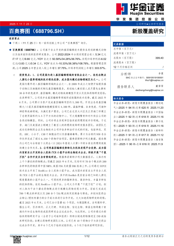 投资亮点:1、公司是国内进入基因编辑领域的首批企业之一,依托在靶点人源化小鼠等领域的技术领先优势,成为国内模式动物领域巨头之一。公司是国内最早进入基因编辑领域的企业之一、自2009年成立之初便开始提供基于动物以及细胞的定制化基因编辑服务,其创始人兼实控人沈月雷先生拥有30余年的免疫学、基因编辑、模式动物疾病模型开发以及抗体药物研发经验;在其带领下,公司逐步在基因编辑等领域形成较强的技术优势。截至2025年6月末,公司累计为客户完成基因编辑项目约5,300项,开发出各类基因编辑大/小鼠及基因编辑细胞模型超过4,300种,涵盖肿瘤、自身免疫、代谢和神经等疾病领域。为满足客户需求,公司已在北京大兴区及江苏海门市建立了总使用面积约5.5万平方米的动物中心、可大规模繁育和对外供应公司的各类动物模型。同时,公司亦将业务延伸至临床前药理药效评价领域,于北京、海门及美国波士顿建立了数百人的药理药效等研发服务团队,该团队已成功支持制药企业及生物技术公司评估多种治疗方式的疗效,包括单抗、双抗、ADC、小分子、CAR-T细胞治疗以及溶瘤病毒等,累计为全球约950名合作伙伴完成了超过6,350个药物评估项目。据弗若斯特沙利文数据,报告期内公司已与全球前十大药企(以2024年度收入计算)中的9家在药理药效板块建立合作关系。2、公司将基因编辑优势转化为抗体发现平台优势,成为国内首家自主开发的全人抗体/TCR小鼠平台的生物技术企业,积极开展“千鼠万抗”合作开发及自有管线研发。根据弗若斯特沙利文数据显示,人体内有上千个潜在的药物靶点;而截至2025年6月末,仅有针对70余个靶点的200余种单抗药物获得中国NMPA、美国FDA及欧盟EMA批准上市。公司通过SUPCE技术自主开发了RenMice全人抗体小鼠平台,成为国内首家自主开发全人抗体/TCR小鼠平台的生物技术企业,其中的RenMab是目前全球已知的人源化程度最高的小鼠平台之一,可得到更多的强特异性、高亲和性、丰富多样性的抗体药物。依托RenMice小鼠平台,公司大力开展“千鼠万抗”计划,拟对人体内千余个潜在药物靶点进行规模化药物发现与开发,目前已完成近700个靶点的单抗以及200余个TAA靶点的双抗制备与筛选,并拟向医药企业转让/授权有潜力的分子或与其进行合作开发,大大加速药物研发的进程;截至2025年6月末,公司已合计签署61个项目,与德国默克、吉利德科学、强生公司、百济神州、正大天晴、华润生物、信达生物、荣昌生物等数十家海内外知名生物科技或医药研发企业达成合作。与此同时,公司亦通过内部临床药物研发平台(全资子公司祐和医药)将部分候选药物推进至IND或临床研究阶段;自建立药物研发团队以来,公司已有10个药物分子与其它药企达成合作开发,其中6个已处于临床试验阶段,4个处于临床前研究阶段。
