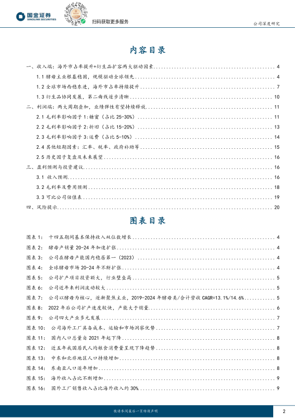 收入端:产能锚定全球第一,中期维度产能超60万吨,产值约240亿元。1)海外产能结构优化,持续提升市占率。十四五期间受宏观需求疲软、行业竞争等影响,国内收入增速放缓,海外市场成为新的增长引擎,21-24年国内/国外收入CAGR分别为6.3%/26.5%。公司近年来加快海外产能布局,围绕潜力市场如非洲、东南亚基于供应链配套和服务优势持续提升份额。目前海外收入占比40%,预计未来5年CAGR为20%,中长期海外占比预计超50%。2)拓展业务领域,大力发展YE、酵母蛋白等高附加值衍生品。随着低盐化、健康化趋势演绎,酵母抽提物逐步成长为15万吨体量大单品,参照发达国家基于替代味精角度仍有2~3倍成长空间。酵母蛋白有望弥补国内蛋白缺口,目前仍处于开发阶段,未来有望复刻YE成长路径,市场空间广阔。