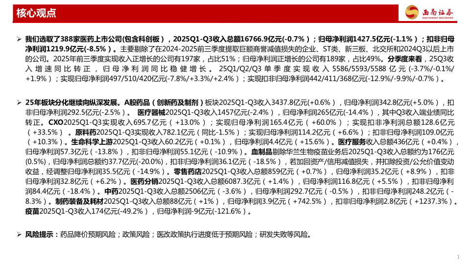 25年板块分化继续向纵深发展。A股药品(创新药及制剂)板块2025Q1-Q3收入3437.8亿元(+0.6%),归母净利润342.8亿元(+5.0%),扣非归母净利润292.5亿元(-2.5%)。医疗器械2025Q1-Q3收入1457亿元(-2.4%),归母净利润265亿元(-14.4%),其中Q3收入端业绩同比转正。CXO2025Q1-Q3实现收入695.7亿元(+13.0%);实现归母净利润165.4亿元(+60.0%);实现扣非净利润总额128.6亿元(+33.5%)。原料药2025Q1-Q3实现收入782.1亿元(同比-1.5%);实现归母净利润114.2亿元(+6.6%);扣非归母净利润109.0亿元(+10.3%)。生命科学上游2025Q1-Q3收入60.2亿元(+0.1%),归母净利润4.4亿元(+15.6%)。医疗服务收入总额436亿元(+0.4%),归母净利润57.3亿元(-13.8%),扣非归母净利润55.1亿元(-10.9%)。血制品剔除华兰生物疫苗业务后2025Q1-Q3收入总额约为176亿元(0.5%),归母净利润总额约37.7亿元(-20.0%),扣非归母净利润36.1亿元(-18.5%),若加回资产/信用减值损失,并扣除投资/公允价值变动收益,经调整归母净利润35.5亿元(-14.9%)。零售药店2025Q1-Q3收入总额859亿元(+0.7%),归母净利润35.2亿元(+8.9%),扣非归母净利润32.8亿元(+6.2%)。医药分销2025Q1-Q3收入总额6087.3亿元(+1.4%),归母净利润116.8亿元(+5.5%),扣非归母净利润84.4亿元(-18.4%)。中药2025Q1-Q3收入总额2506亿元(-3.6%),归母净利润292.7亿元(-0.5%),扣非归母净利润248.2亿元(-8.3%)。制药装备及耗材2025Q1-Q3收入总额88亿元(+1%),归母净利润3.9亿元(+742.5%),扣非归母净利润2.8亿元(+1237.3%)。疫苗2025Q1-Q3收入174亿元(-49.2%),归母净利润-9亿元(-121.6%)。