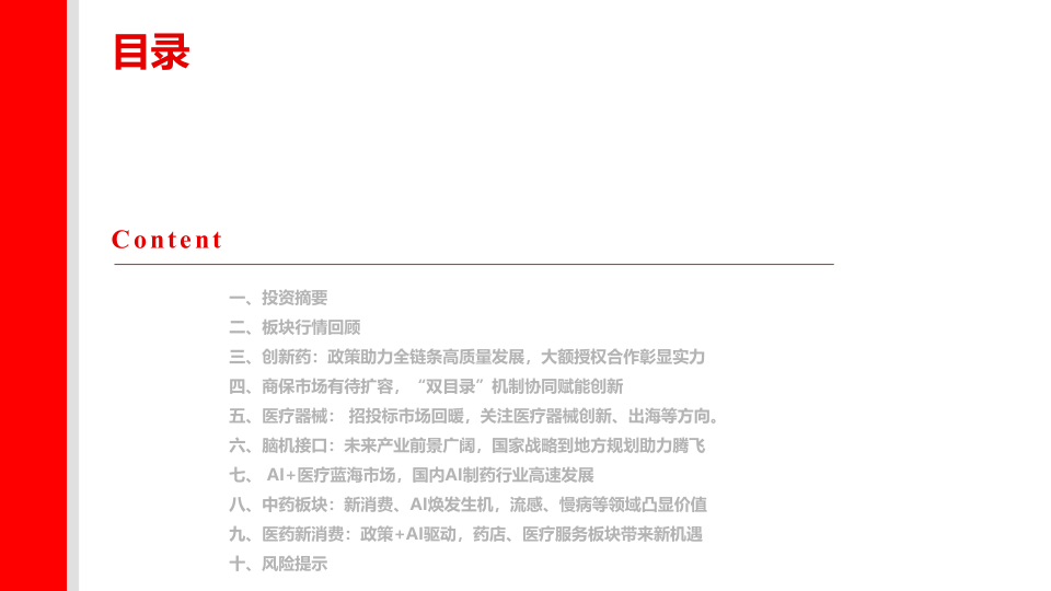 科技赋能下的医药行业创新:脑机接口领域政策支持、技术突破;人工智能在医疗领域的应用等。