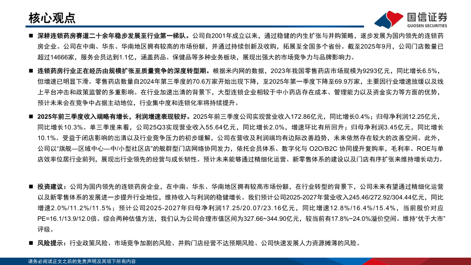 投资建议:公司为国内领先的连锁药房企业,在中南、华东、华南地区拥有较高市场份额,在行业转型的背景下,公司未来有望通过精细化运营以及新零售体系的发展进一步提升行业地位,维持收入与利润的稳健增长。我们预计公司2025-2027年营业收入245.46/272.92/304.44亿元,同比增速2.0%/11.2%/11.5%;预计公司2025-2027年归母净利润17.25/20.07/23.16亿元,同比增速12.8%/16.4%/15.4%,当前股价对应PE=16.1/13.9/12.0倍。综合两种估值方法,我们认为公司合理市值区间为327.66~344.90亿元,较当前有17.8%~24.0%溢价空间。维持“优于大市”评级。