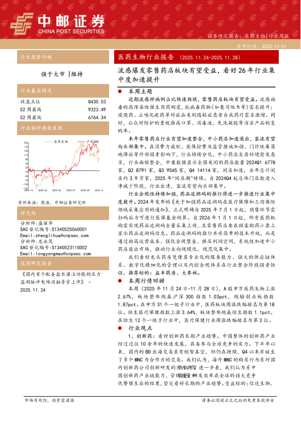 医药生物行业周报:流感爆发零售药店板块有望受益,看好26年行业集中度加速提升