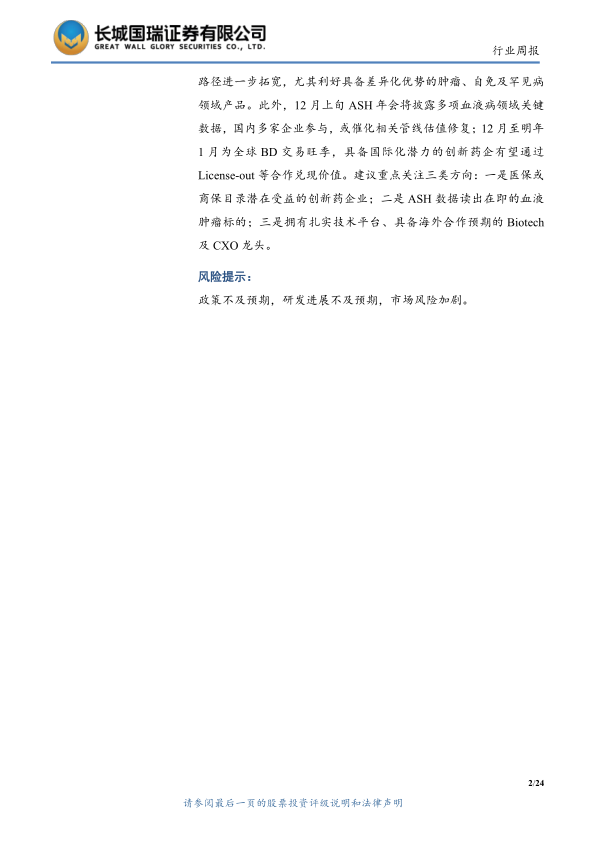 国常会近期部署推进医保省级统筹,强调提升基金使用效率、强化基层服务能力,并协同推进分级诊疗,有望为高性价比产品和基层渠道扎实的企业营造更稳定的支付环境。2025年国家医保谈判结果将于12月初公布,叠加首版“商保创新药目录”同步落地,创新药支付路径进一步拓宽,尤其利好具备差异化优势的肿瘤、自免及罕见病领域产品。此外,12月上旬ASH年会将披露多项血液病领域关键数据,国内多家企业参与,或催化相关管线估值修复;12月至明年1月为全球BD交易旺季,具备国际化潜力的创新药企有望通过License-out等合作兑现价值。建议重点关注三类方向:一是医保或商保目录潜在受益的创新药企业;二是ASH数据读出在即的血液肿瘤标的;三是拥有扎实技术平台、具备海外合作预期的Biotech及CXO龙头。