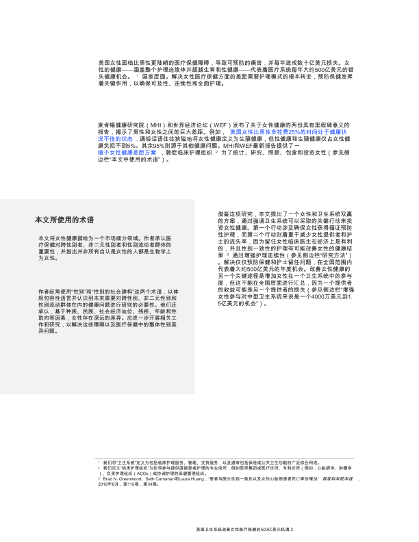 麦肯锡健康研究院(MHI)和世界经济论坛(WEF)发布了关于女性健康的两份具有里程碑意义的报告,揭示了男性和女性之间的巨大差距。例如,美国女性比男性多花费25%的时间处于健康状况不佳的状态.通俗话语往往狭隘地将女性健康定义为生殖健康,但性健康和生殖健康仅占女性健康负担不到5%。其余95%则源于其他健康问题。MHI和WEF最新报告提供了一缩小女性健康差距方案,敦促临床护理组织为了统计、研究、照顾、包含和投资女性。