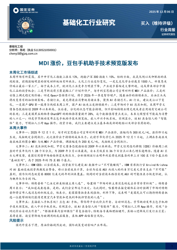 基础化工行业研究:MDI涨价,豆包手机助手技术预览版发布