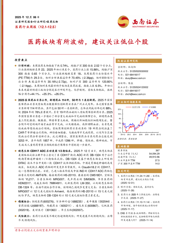 行情回顾:本周医药生物指数下跌0.74%,跑输沪深300指数2.02个百分点,行业涨跌幅排名第22。2025年初以来至今,医药行业上涨15.86%,跑输沪深300指数0.65个百分点,行业涨跌幅排名第18。本周医药行业估值水平(PE-TTM)为29.3倍,相对全部A股溢价率70.45%(-2.36pp),相对剔除银行后全部A股溢价率为30.16%(-2.72p),相对沪深300溢价率为120.80%(-2.14pp)。本周相对表现最好的子板块是医药流通,指数上涨6.5%,年初以来表现最好的前三板块分别是医疗研发外包、化学制剂、其他生物制品,涨跌幅分别为+44.1%、+35.3%、+26.0%。