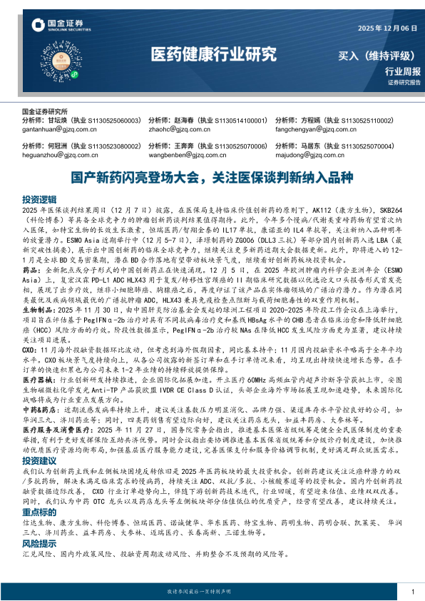 2025年医保谈判结果周日(12月7日)披露,在医保局支持临床价值创新药的原则下,AK112(康方生物),SKB264(科伦博泰)等具备全球竞争力的肿瘤创新药谈判结果值得期待。此外,今年多个慢病/代谢类重磅药物有望首次纳入医保,如特宝生物的长效生长激素,恒瑞医药/智翔金泰的IL17单抗,康诺亚的IL4单抗等,关注新纳入品种明年的放量潜力。ESMO Asia近期举行中(12月5-7日),泽璟制药的ZG006(DLL3三抗)等部分国内创新药入选LBA(最新突破性摘要),展示出中国创新药的临床全球竞争力,继续关注更多新药近期大会数据更新。此外,即将进入的12-1月是全球BD交易密集期,潜在BD合作落地有望带动板块景气度,继续看好创新药板块投资机会。