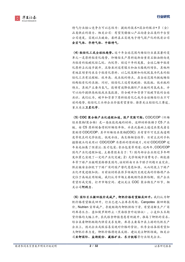 (5)COC聚合物产业化进程加速,国产突围可期。COC/COP(环烯烃共聚物/聚合物)是一类性能优越的材料,这种材料依赖于C5产业链,由C5原料制备得到环烯烃单体,并在此基础上通过共聚或者自聚制得COC/COP。其中环烯烃共聚物(COC)具有紫外可见区高透明度等优良的光学性能,低吸水性,高生物相容性等。目前主流的手机摄像镜头均采用以COC/COP为原料的塑料镜片,同时COC/COP近年来也拓展了预灌注、医疗包装、食品包装等用途。近两年,COC/COP国内产业化进程加速,主要原因来自于:1)国内部分企业经过多年研发积累已实现了一定的产业化突破;2)光学领域中消费电子、新能源车等下游产业链明显转移至国内,该材料由日本卡脖子问题日益突出,供应链安全担忧下下游厂商的国产替代意愿加强,从而促使上下游产业化开发进程加快。目前该材料在很多领域仍呈现过高的价格将产品定位于高端应用领域,我们认为市场主要瓶颈仍在供给侧,国产企业有望形成突围,打开市场空间。建议关注COC聚合物生产环节,相关公司阿科力。